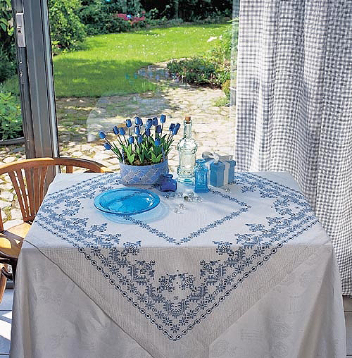 Tischdecke (ungesäumt), ca. 95 x 95 cm, 2 Farben, Leinen weiss, 4 1/2 Kreuze/1 cm, Kreuzstich