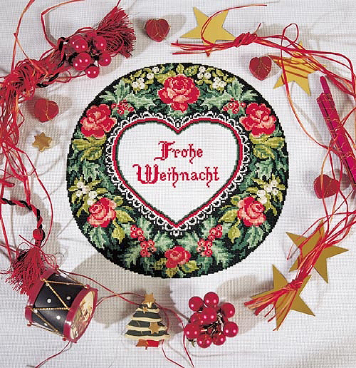 Zusätzlich Herzlich Willkommen und Viel Glück, Gestick rund ca. 23 cm, 12 Farben, Aidastoff, weiss, 7 Kreuze/1 cm, Kreuzstich